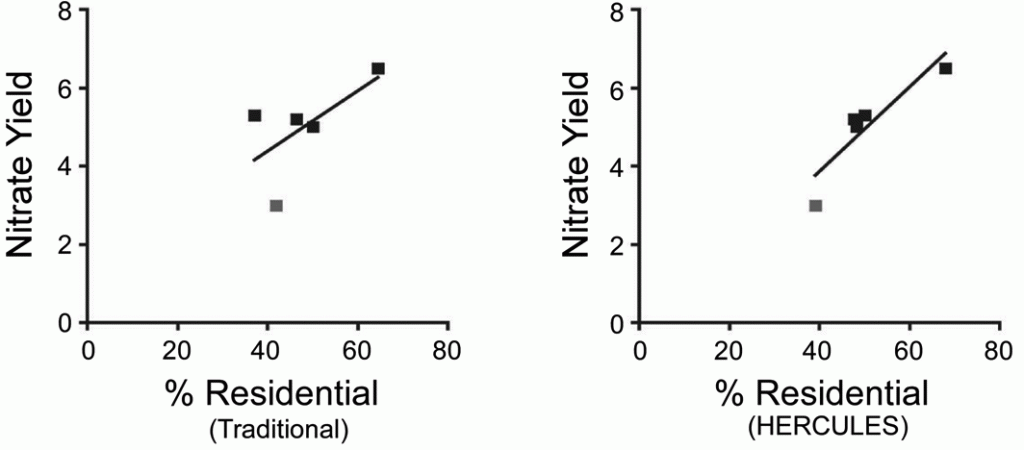 Unlike the traditional classifications, HERCULES allows researchers, planners, and decision makers to understand the combination of social artifacts and natural components throughout a metropolitan area. An example is the relationship of the amount of nitrate pollution in streams draining parts of the Gwynns Falls watershed of metropolitan Baltimore, MD with the land cover of those small watersheds. They found that nitrate pollution is statistically associated with changes in patch features as assessed by HERCULES, but is not predicted by the traditional classification. Such findings have contributed to regional policy decisions to increase tree canopy cover throughout urban regions as a stormwater improvement strategy. Such improvement is key to improving the environment of both local neighborhoods and the water quality of the Chesapeake Bay.
