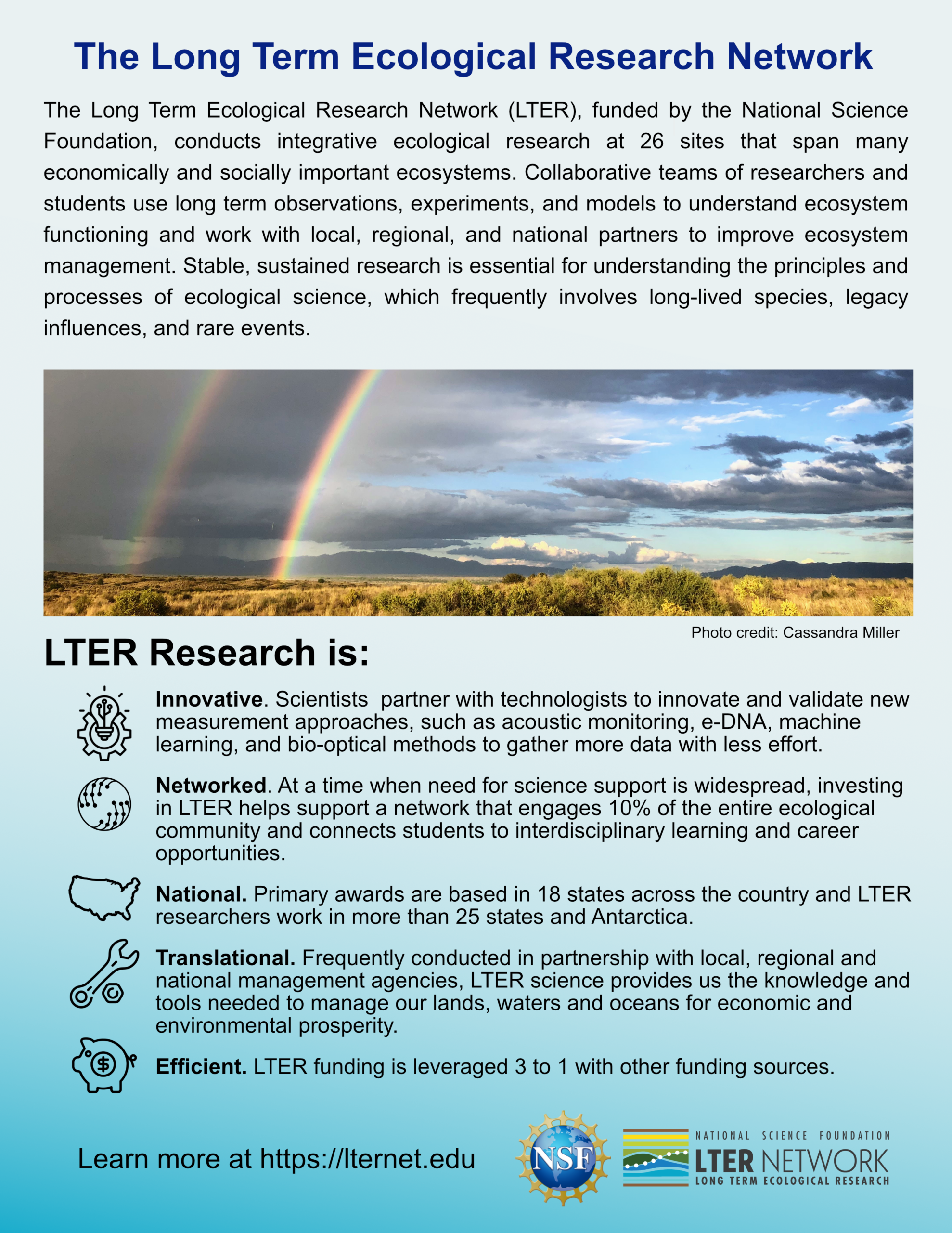 The 2025 LTER Network one-pager is designed to be used in conjunction with a similar site-centric document to describe how sites work together as a network to provide value to researchers, environmental managers, and communities at both the local and national scales.