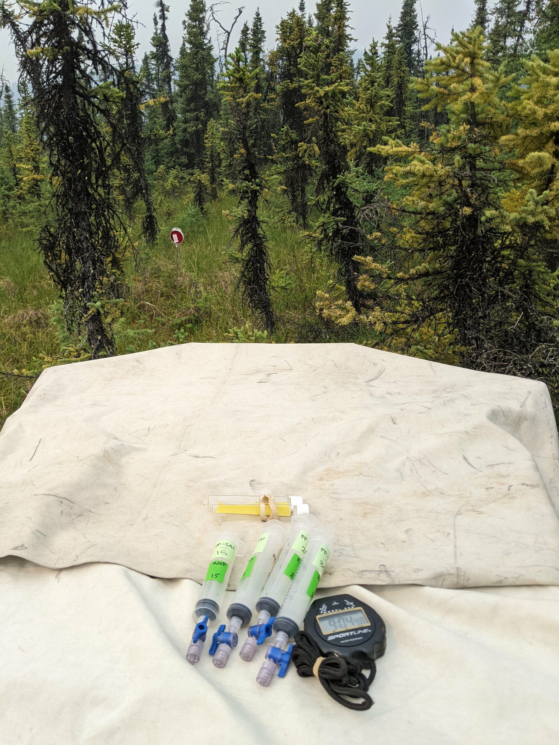 Field Technician Sarah Kennings flushes a chamber to ensure the concentration of CO2 inside matches the ambient atmosphere around it. After ceiling the container with the orange clips shown, the IRGA (photo center, in clear box) will be able to measure how the concentration inside changes, allowing scientists to calculate the rate of CO2 change, or gas flux.