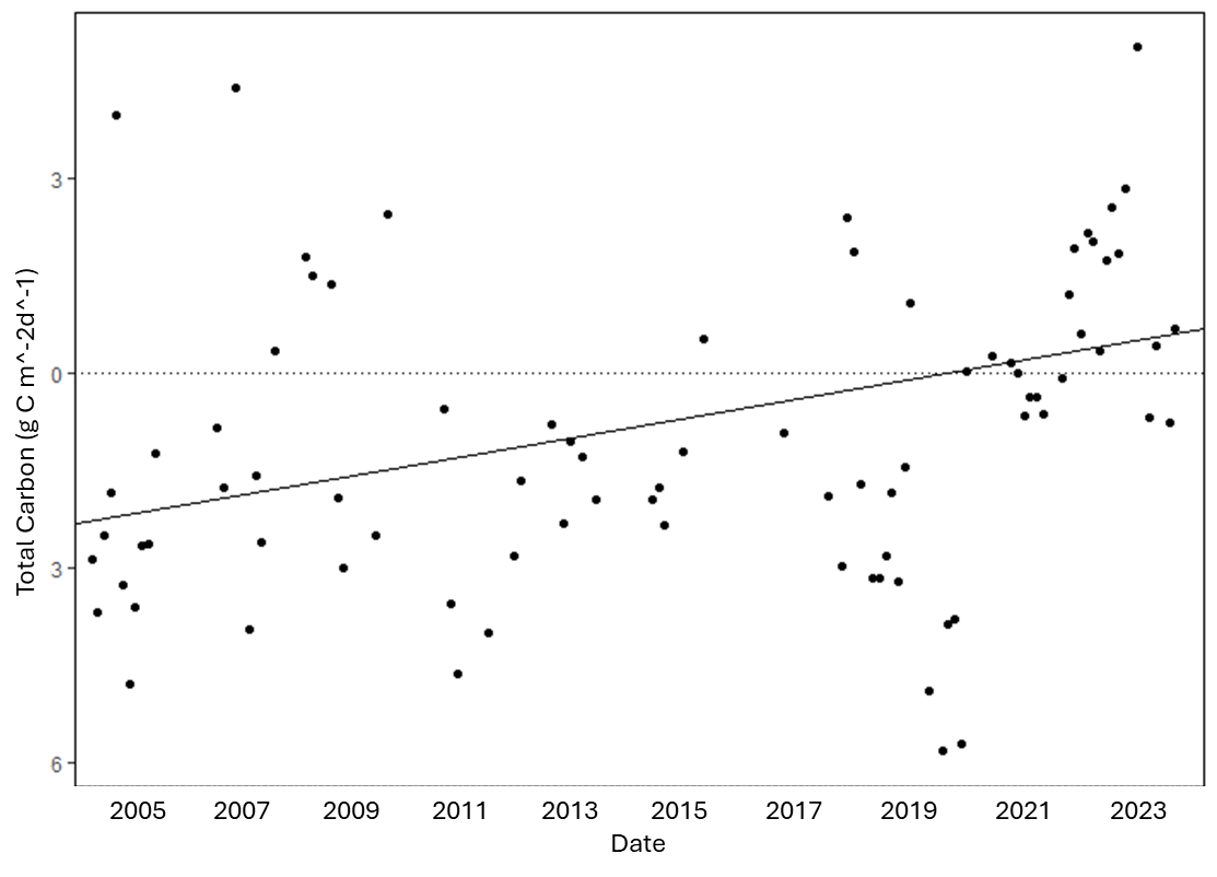Portable Infrared Gas Analyzers (IRGAs) are used to measure the concentration of CO2 at the Alaska Peatland Experiment. Since the program started in 2005, the ambient amount of CO2 in the air has gone from roughly 379 ppm to 425ppm! (data via Lan, X., Tans, P. and K.W. Thoning: Trends in globally-averaged CO2 determined from NOAA Global Monitoring Laboratory measurements. Version 2025-05 https://doi.org/10.15138/9N0H-ZH07)