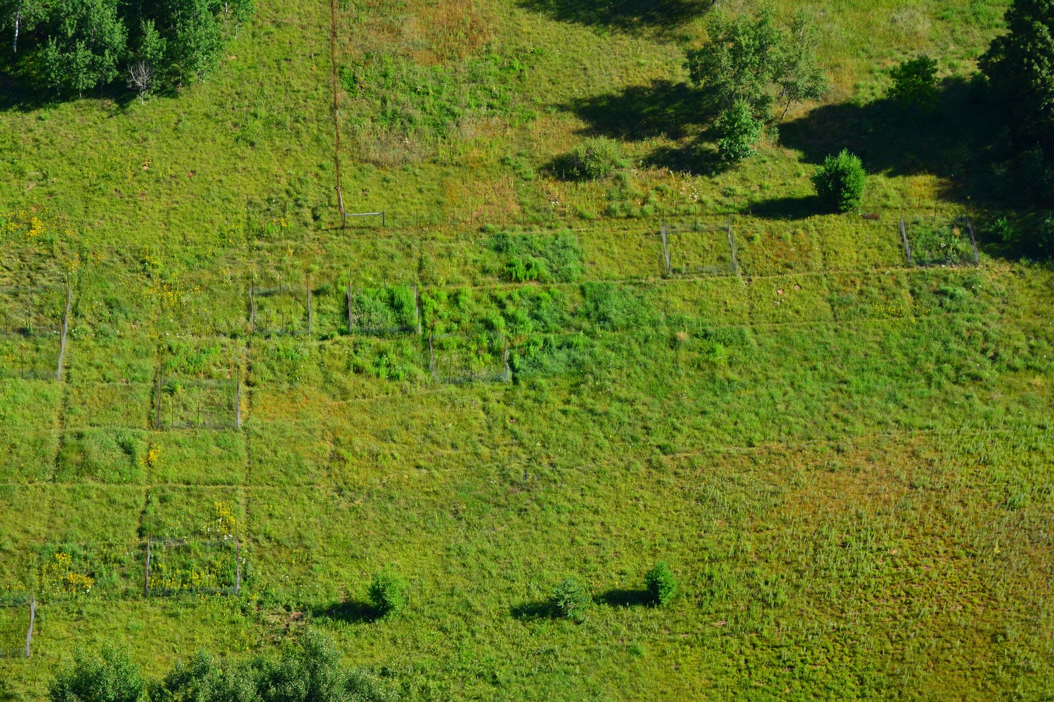 Nutrient Network Plots at the Cedar Creek LTER site. Square plots have had different combinations of nutrients added. Differences in aboveground growth as a result of nutrient addition are visible across plots.