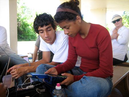 Timothy Hidalgo-Vega and Vanessa Castellaños from the Felix Varela Senior High School Global Studies MAGNET testing equipment before collecting data under the watchful eye of Research Experience for Teacher fellow, Ms. Catherine Laroche