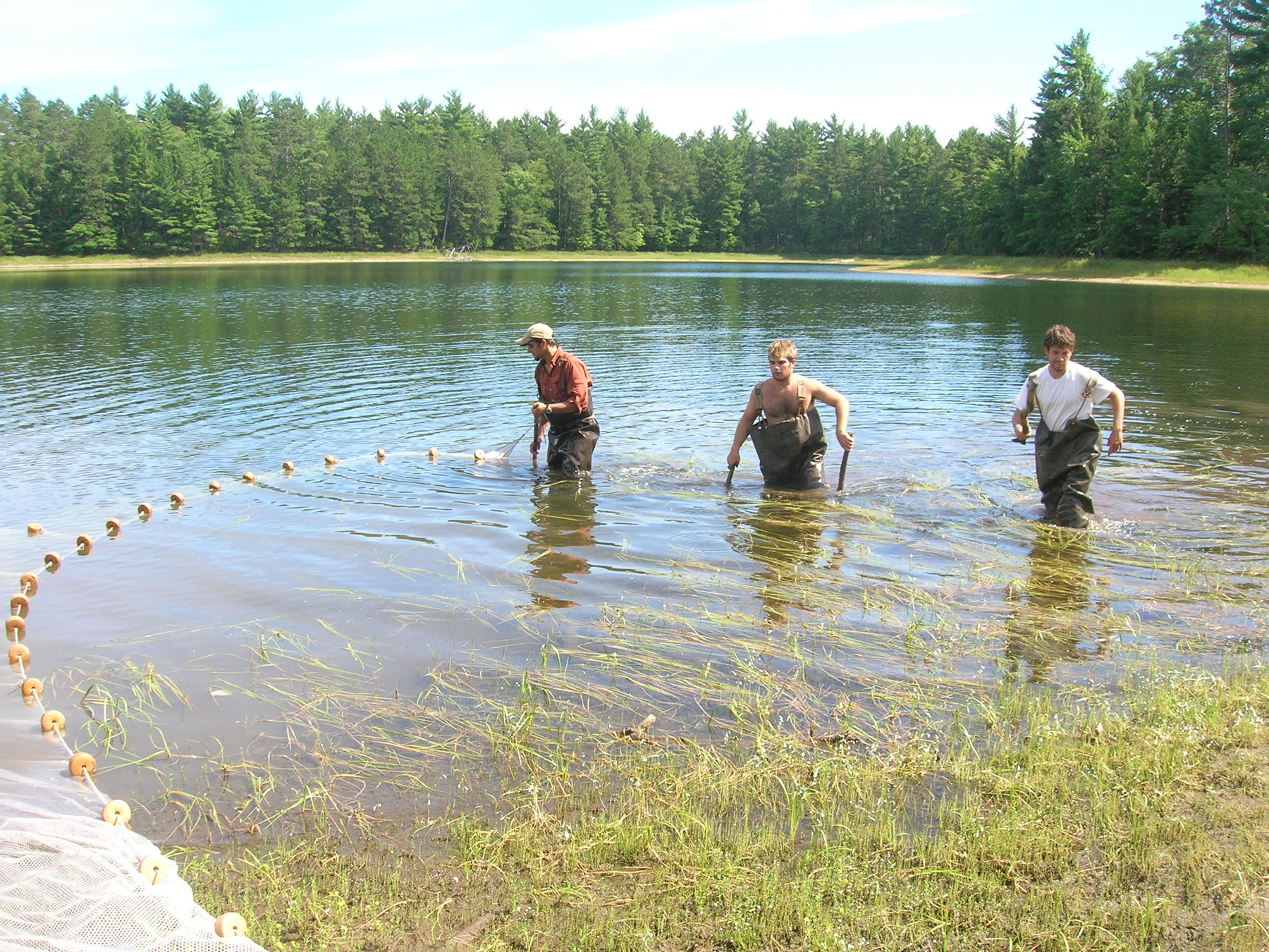 Biocomplexity project team beach seining to obtain population estimates of bluegill and young-of-the-year largemouth bass to determine the impact of coarse woody habitat on fish communities. Study site: Camp Lake, Northern Highlands Lake District, Wisconsin. 2007. Danielle Haak. Danielle Haak CC BY-SA 4.0