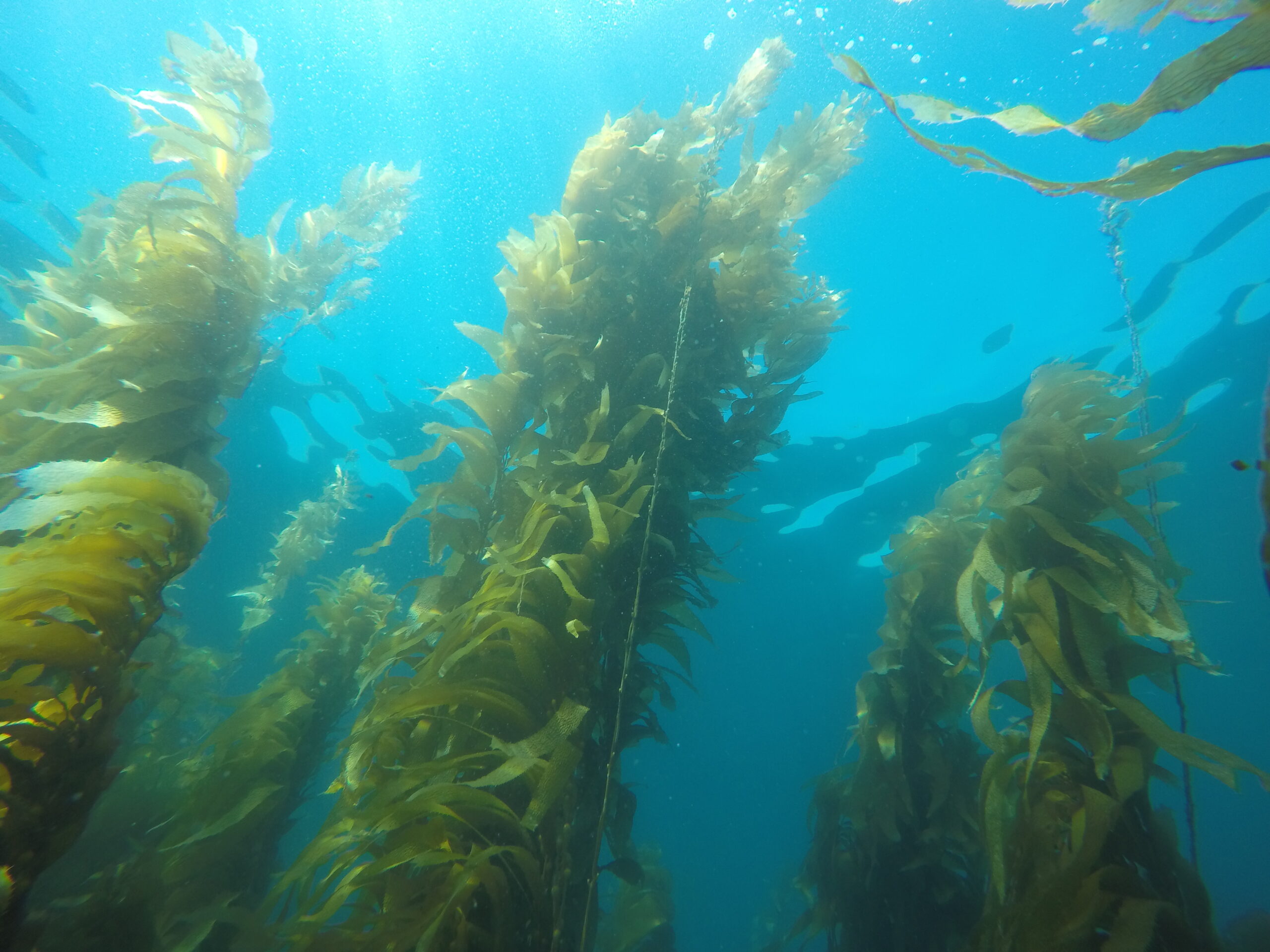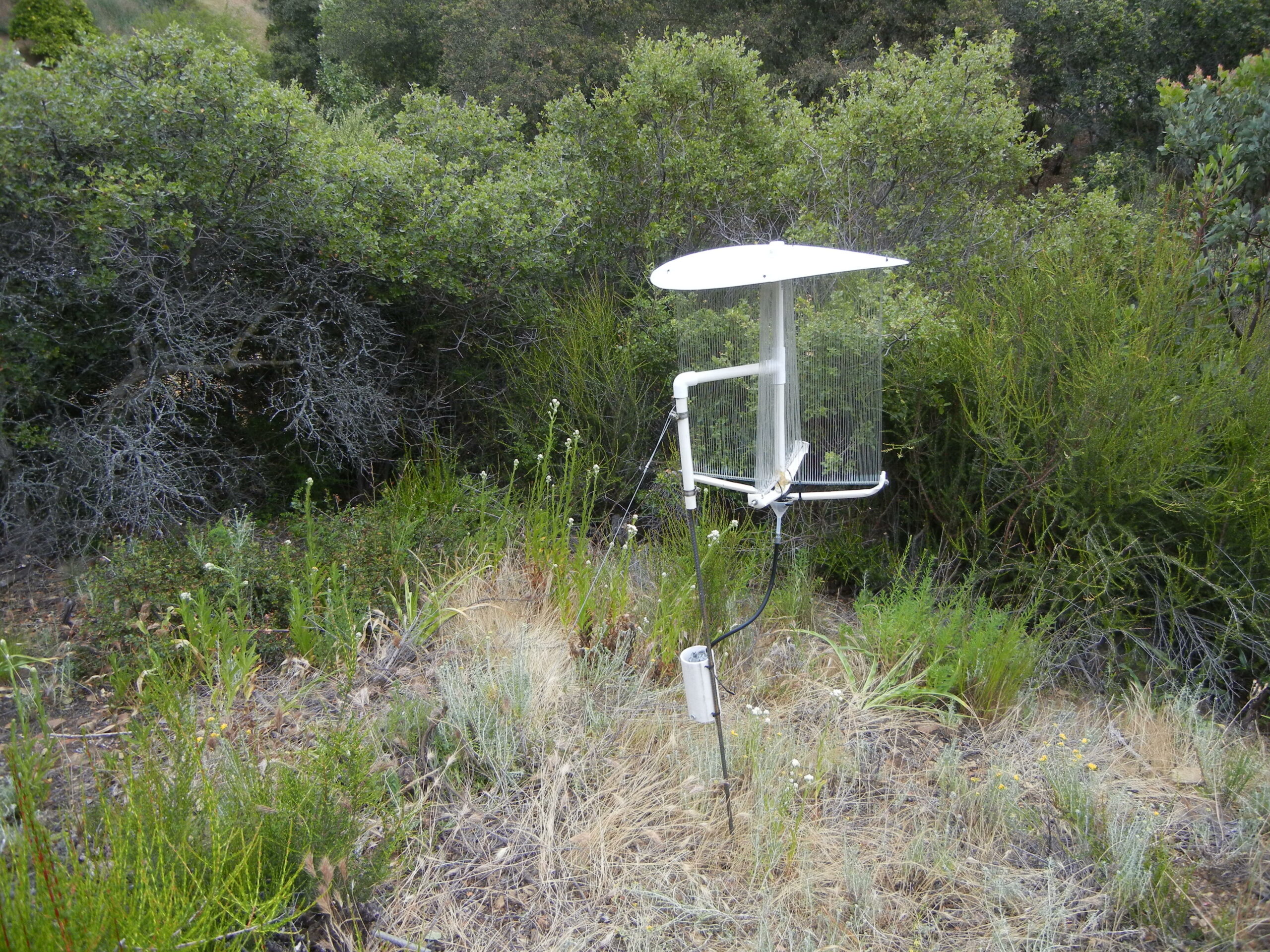 The Fog Collector. It looks like a harp with two perpendicular sets of strings. As fog water condenses on the vertical strings, it drips down into PVC funnels and is collected in a container with mineral oil in it to prevent the water from evaporating.