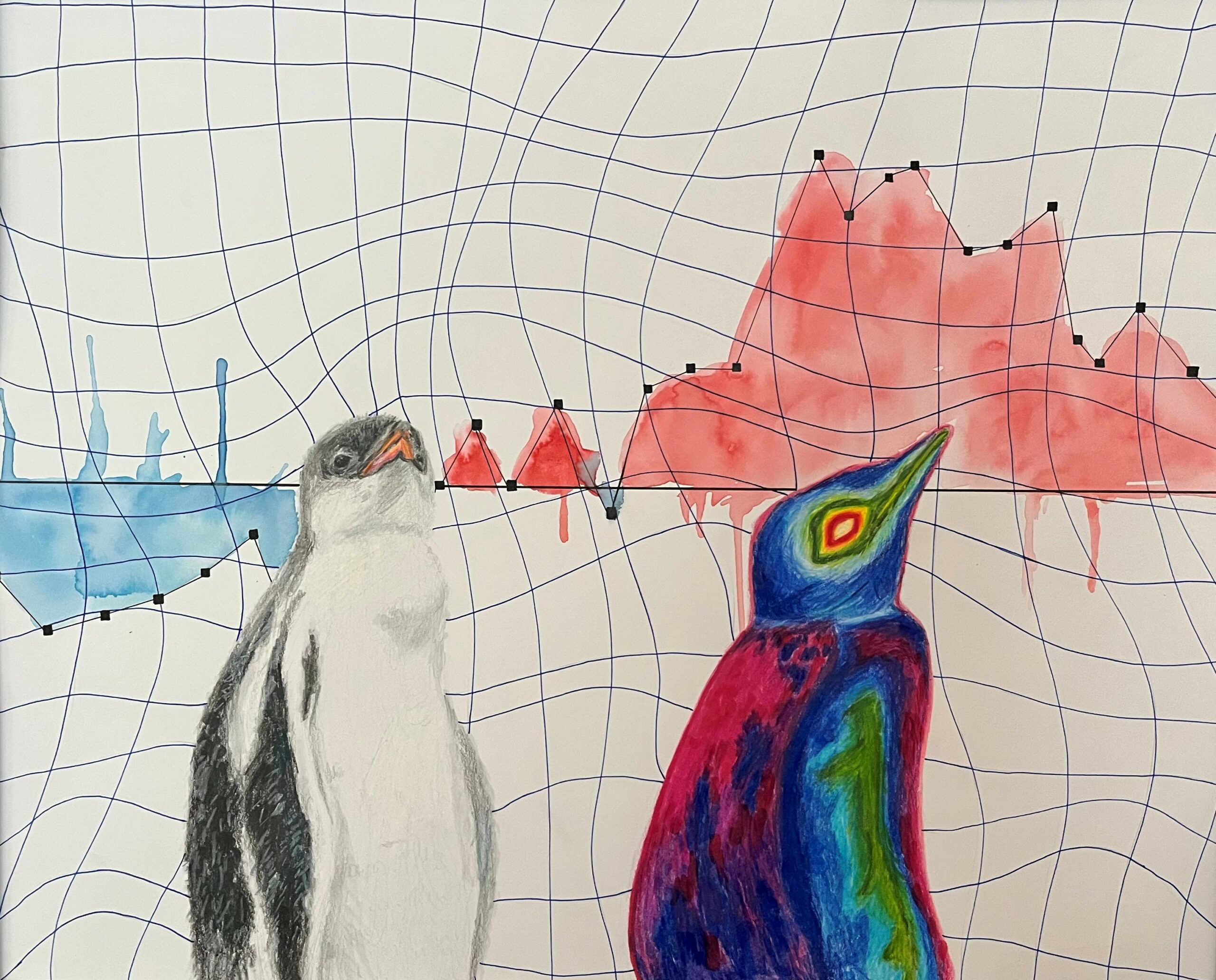 “I wanted there to be a contrast between the realism of the penguin to the realism of the scientific data. The warped lines of the graph represent the warped perception of global warming through society, and how information can be misconstrued. The Gentoo chicks are to be a representation of the real life impacts that temperature increase can have on nature, and the animals that are the essential life and heart-beat of that environment.” – Abigail