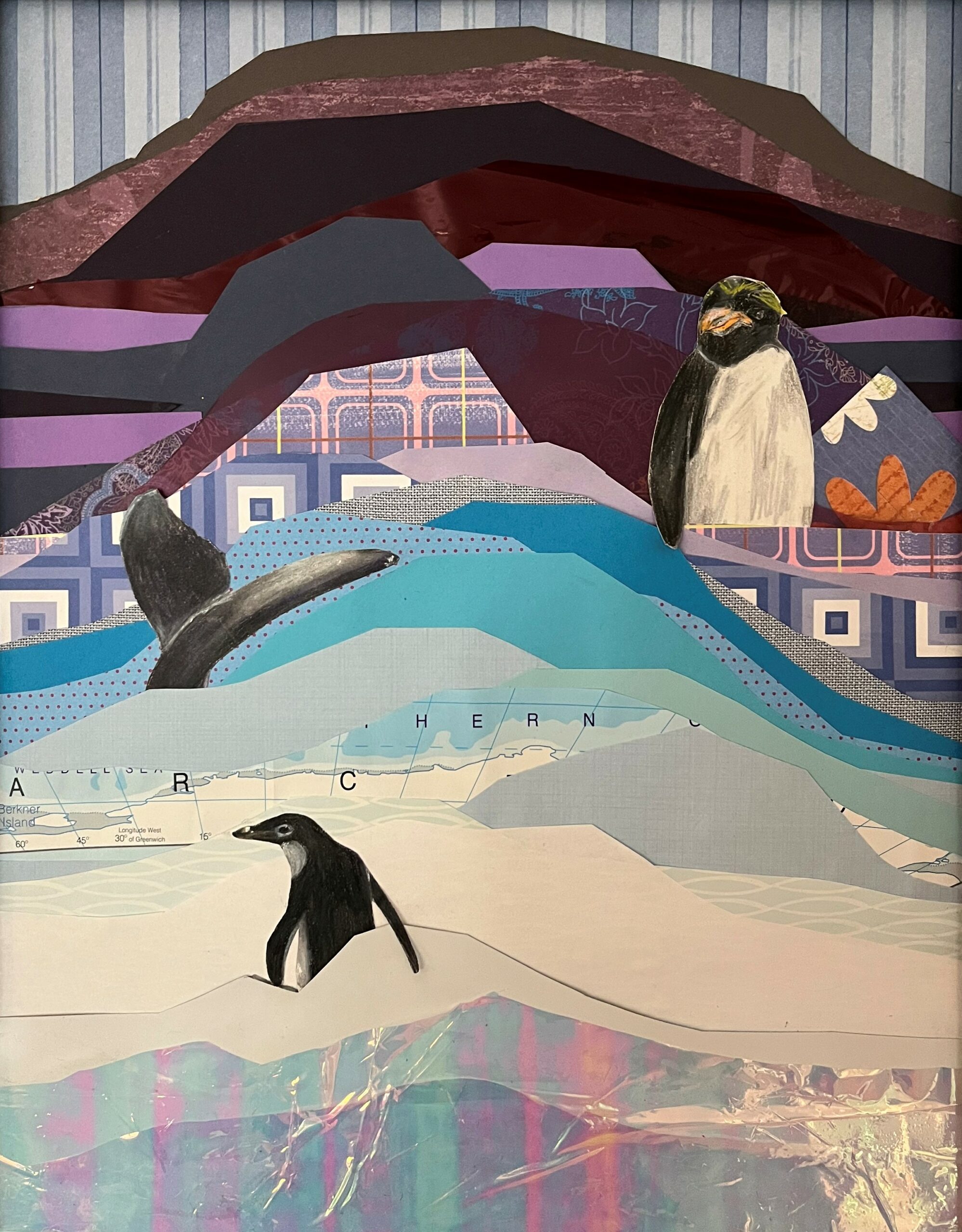 “I used various thickness of paper (thick to thin) to show the decrease in sea ice area over time. The colors help represent temperature and decreased sea ice strength over time as well. My hope is that this piece demonstrates that art can be beautiful while also being informational and educational. The layered papers thin as time increases into just transparent pieces of film at the bottom, so what will become of the penguin’s habitat once that paper is no longer there?” – Abigail