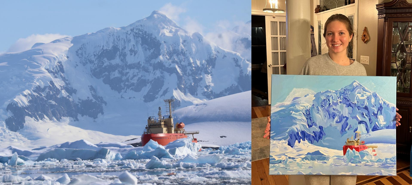 For me, this realization did not come from some wisdom, but was taught to me by my younger sister-in-law, Abigail Willis, who was in high-school at the time. Her art style of choice is painting, and while modest, she is something of a prodigy in my opinion. For my birthday, she wanted to paint my favorite photo that I had taken and I chose one of the Laurence M. Gould in a field of icebergs with the continent in the background (figure 2). This magnificent ice breaker was recently retired by the National Science Foundation and this photo was from its last major oceanographic expedition; a nice painting to commemorate the moment would be a wonderful addition to my home.